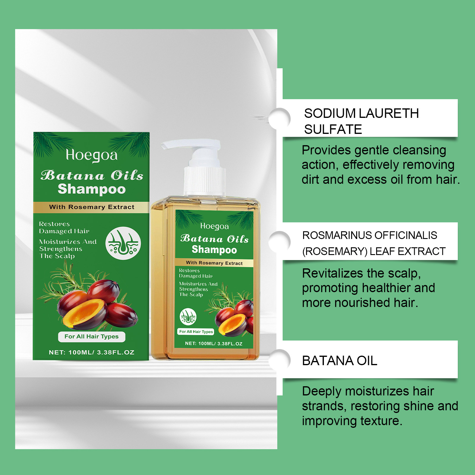 Tento šampón spája silu batánového oleja a rozmarínového extraktu, ktoré prirodzene stimulujú krvný obeh v pokožke hlavy a posilňujú oslabené korienky.