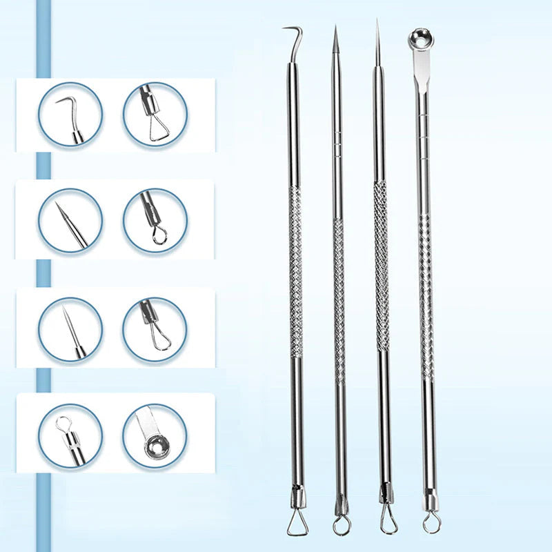 Ľahko použitelný: Tento súbor na odstránenie pupínov je ľahko použitelný a pomáha rýchlo a efektívne odstrániť pupínov a iné nečistoty z pokožky. Nástroj s dvojitou hlavicou má zakrivlenú konštrukciu